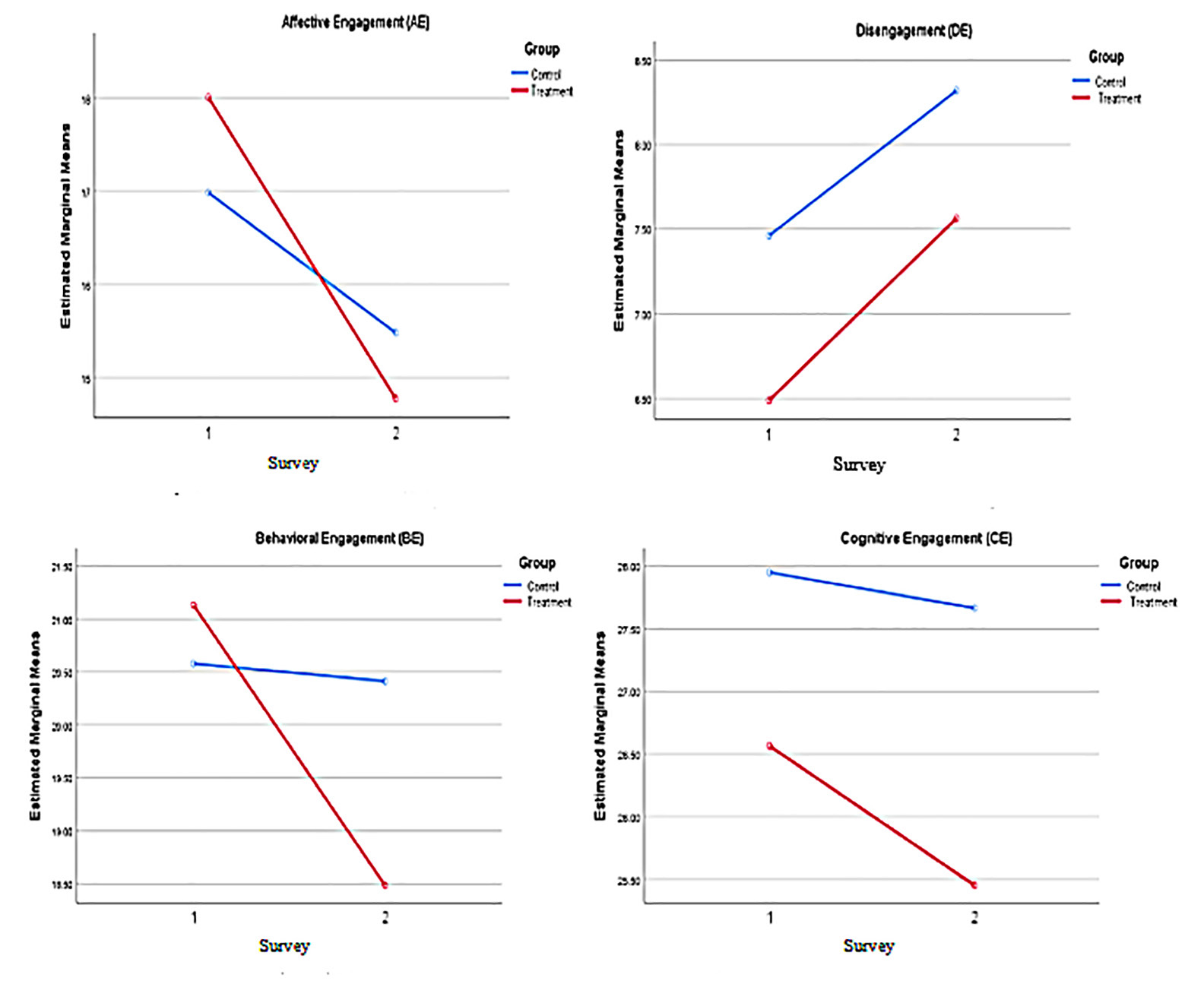 The Confirmative Factor Analysis (CFA) data aligned with the Cronbach's alpha results and identified strong reliability in the AE survey question subset CE as well. However, the confirmative factor analysis results for CE were not as robust compared to those of AE. Lastly, the BE and DE data did not fit the measurement model within CFA. A repeated measures ANOVA was completed for each sample set of engagement questions with the treatment and control group with the two time points of data collection (survey 1 and survey 2). In order to normalize the data, the pre-survey was applied as the co-variate to the repeated measures ANOVA (Table 3).